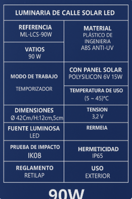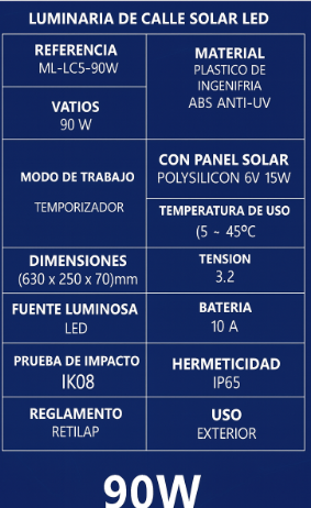 LUMINARIA DE CALLE SOLAR 90W (3,2V 15Ah) CON PANEL INTEGRADO (4V - 15W) 12 MESES DE GARANTIA